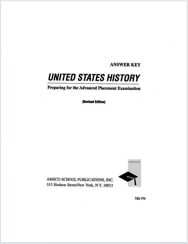 这是 《United States History: Preparing for the Advanced Placement Examination》 的答案手册(Answer Key),由 AMSCO School Publications 出版。这本书是 AP 美国历史(APUSH)备考的经典教材之一,广泛用于课堂教学和学生自学。答案手册提供了教材中练习题的详细解答,帮助学生更好地理解知识点并评估自己的学习情况。