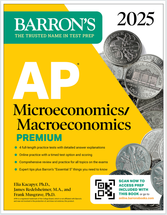 这本书是 《Barron's AP Microeconomics/Macroeconomics Premium, 2025》,由 Elia Kacapyr, Ph.D.、James Redelsheimer, M.A. 和 Frank Musgrave, Ph.D. 编写,出版方为 Barron's Educational Series。这本书是专为备考 AP Microeconomics 和 AP Macroeconomics 考试的学生设计的综合性备考指南,涵盖考试所需的所有核心知识点,并提供详尽的练习和模拟测试。