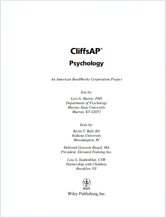 这本书的中文译名通常是 《Cliffs AP心理学教材》。这是由 Wiley 出版社旗下著名的 CliffsNotes 品牌出版的一本AP考试备考指南。CliffsNotes 系列以其精炼的总结和针对性的备考策略而闻名,是美国学生常用的学习辅助工具。
