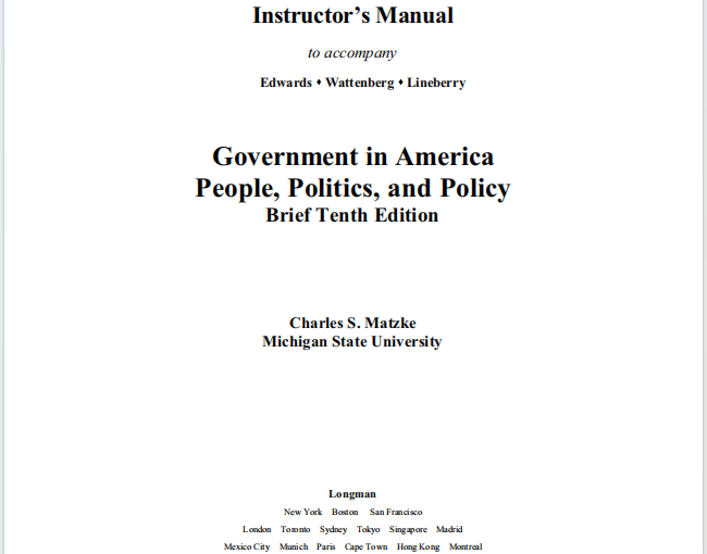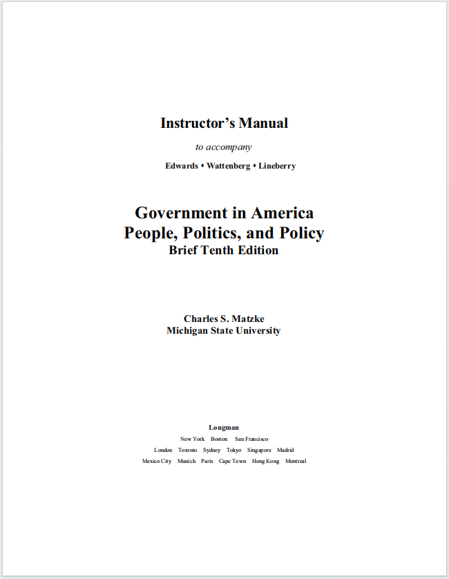 文件全称:Instructor’s Manual to accompany Edwards • Wattenberg • Lineberry: Government in America: People, Politics, and Policy, Brief Tenth Edition