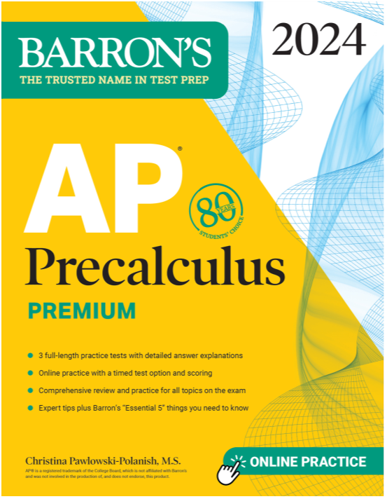 这是一本AP Precalculus(AP预微积分)考试备考指南,书名为 《AP Precalculus Premium, 2024: 3 Practice Tests + Comprehensive Review + Online Practice》,作者是 Christina Pawlowski-Polanish,由 Barron’s Educational Series(Kaplan旗下) 出版。